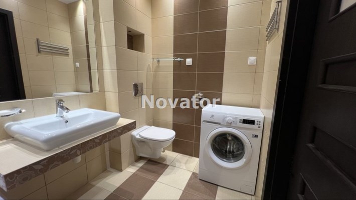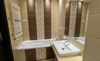 - Łazienka z wanną i pralką.