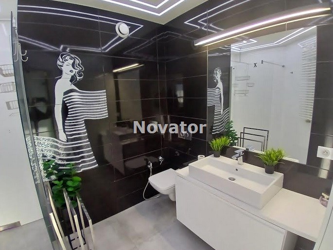 Wyposażenie łazienki lustro, natrysk, pralka, umywalka, WC